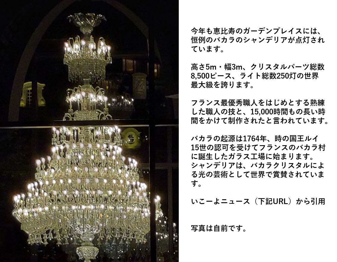 ガーデンプレイスには11月8日よりバカラのシャンデリアが点灯されています。