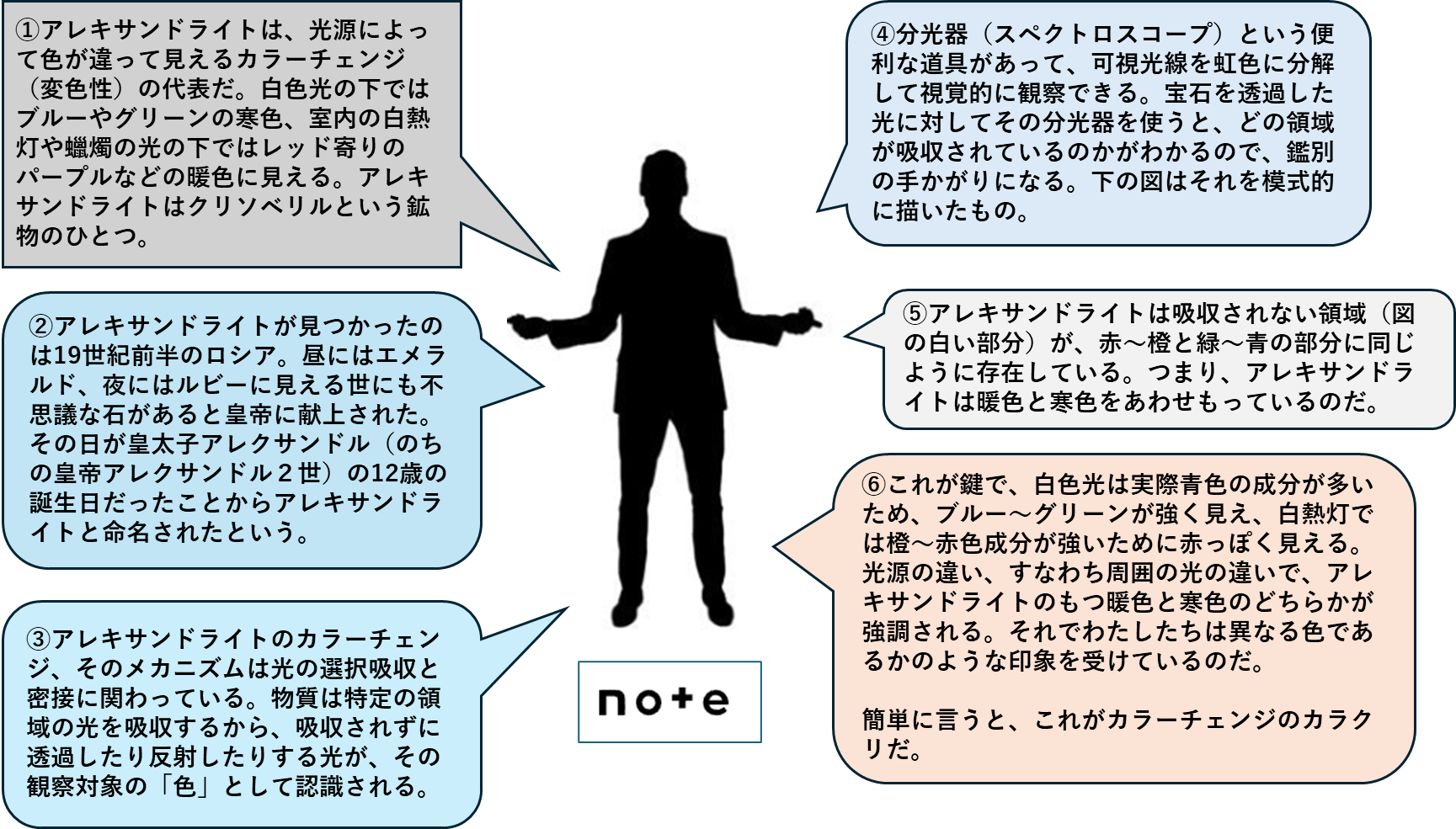 順番に見ていきます。①ではアレキサンドライトはクリソベリルという鉱物のひとつです。この化学的な組成は後でまた詳しく説明します。②昼にはエメラルド、夜にはルビーに見えるというこの宝石、19世紀にロシアで発見され、皇帝に献上されたところ、たまたまその日が誕生日であった皇太子の名前が付けられたというのが名前の由来です。