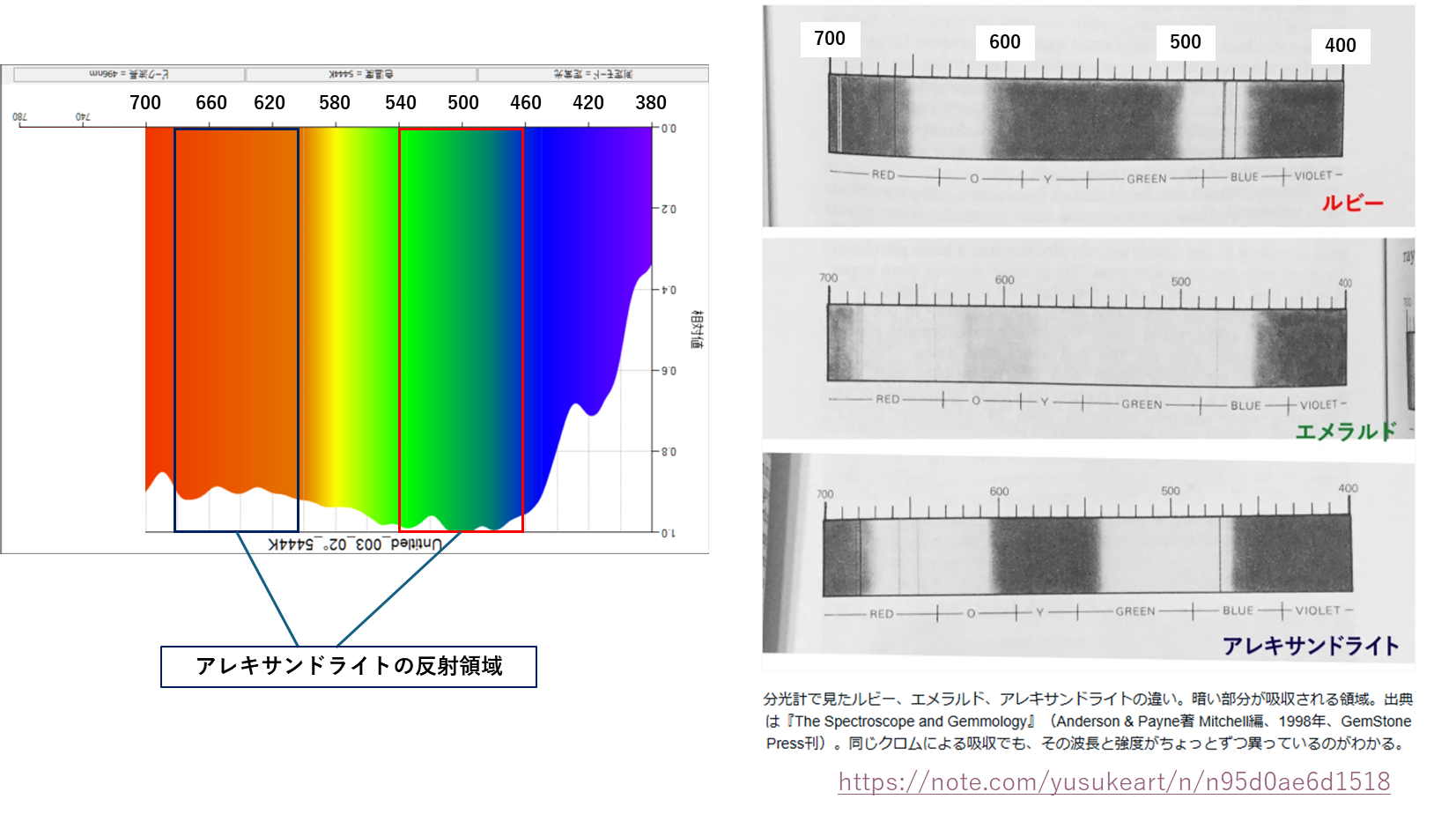 ⑤チャートの白い部分は吸収されていないことを示しており、アレキサンドライトは二つの強い吸収されない領域があります。波長の短い方の領域は460nm~540nnm、長い方の領域は600nm~680nmであり、それぞれ青から緑、橙から赤色に相当しています。一方、540nm~600は強い吸収帯であり、色としては黄色を中心とした光が強く吸収されています。