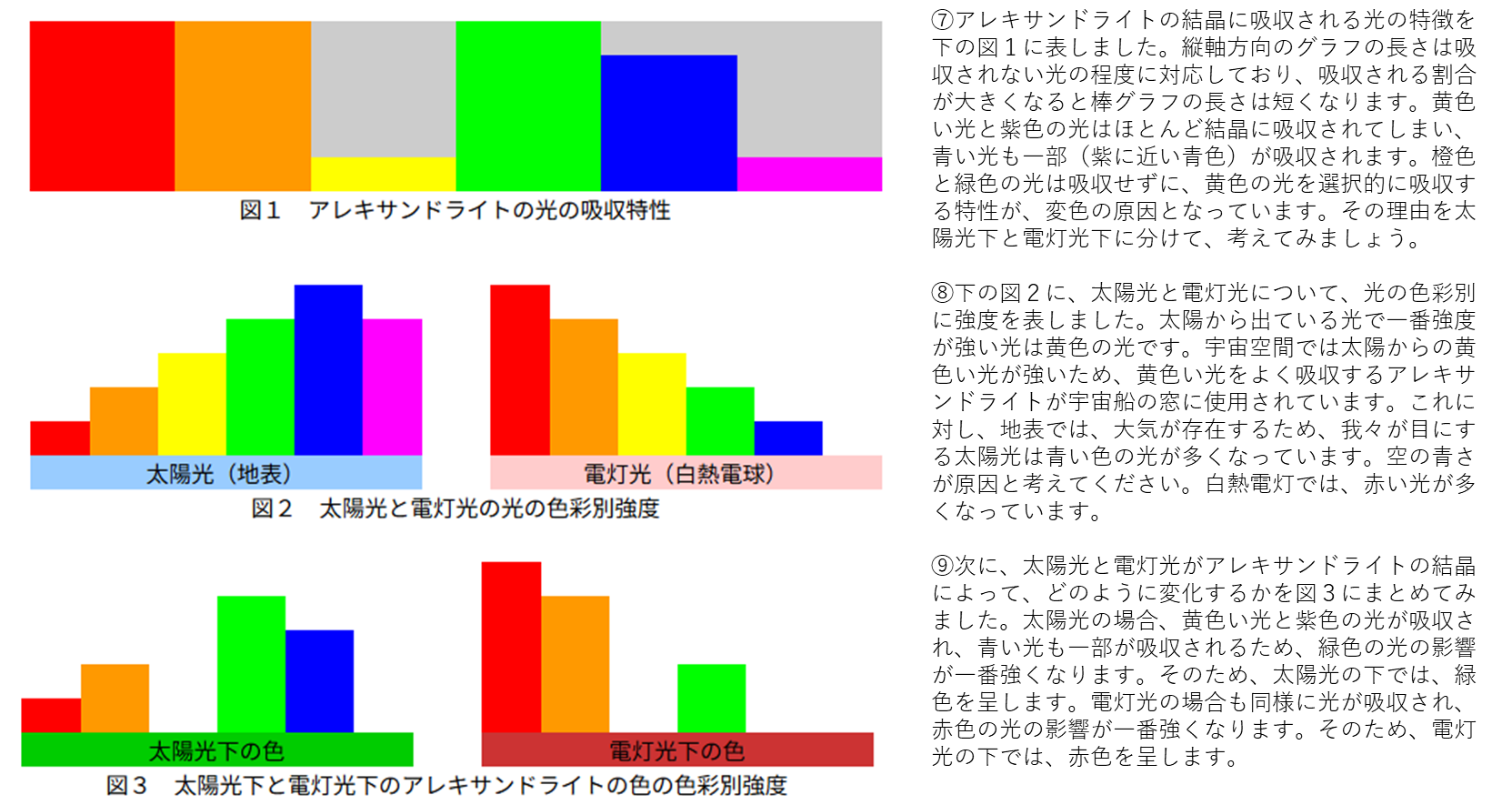 ⑦可視光のうち、紫と黄色はアレキサンドライトにほとんど吸収されてしまいます。また青はわずかに吸収されますが、緑、橙、赤は吸収されません。(図1)昼と夜とで変色するのはこの黄色の特異的な吸収によります。