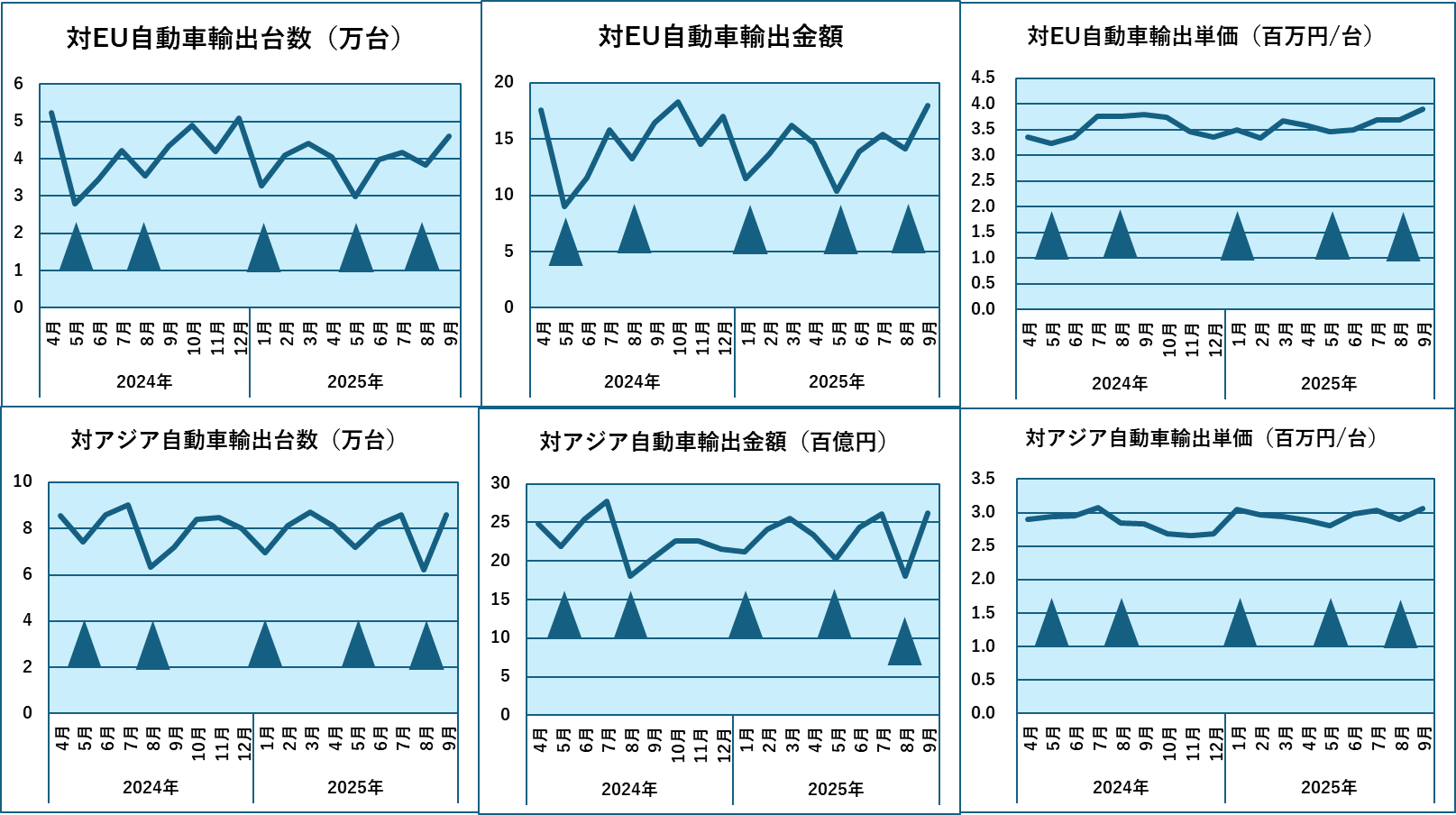 これらのグラフは地区別の自動車輸出の推移を示しており、左から月間の輸出台数(万台)、輸出金額(百億円)、単価(百万円/台)、上から順に、輸出全体、対米、対EU、対アジアです。▲は日本の休日の関係で輸出が落ち込む1月、5月、8月を示しています。