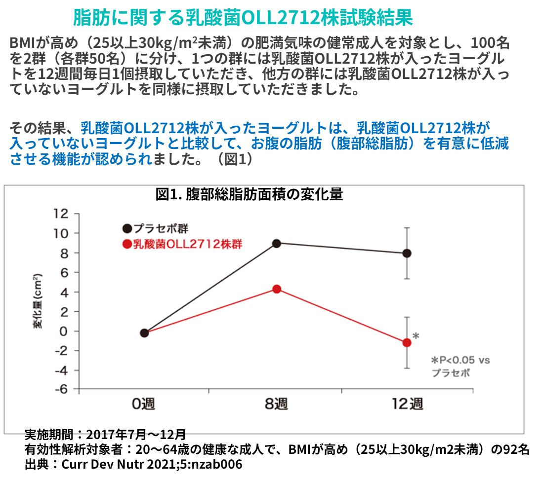 あれれ、ヨーグルトはどこで出てくるの?と思った方、もう少しお待ちください。いよいよヨーグルトに入っている乳酸菌OLL2712群が登場します。実はこの血糖値を下げる優れモノのヨーグルトは、まずは脂肪の蓄積を低減させる効果を調べられていました。