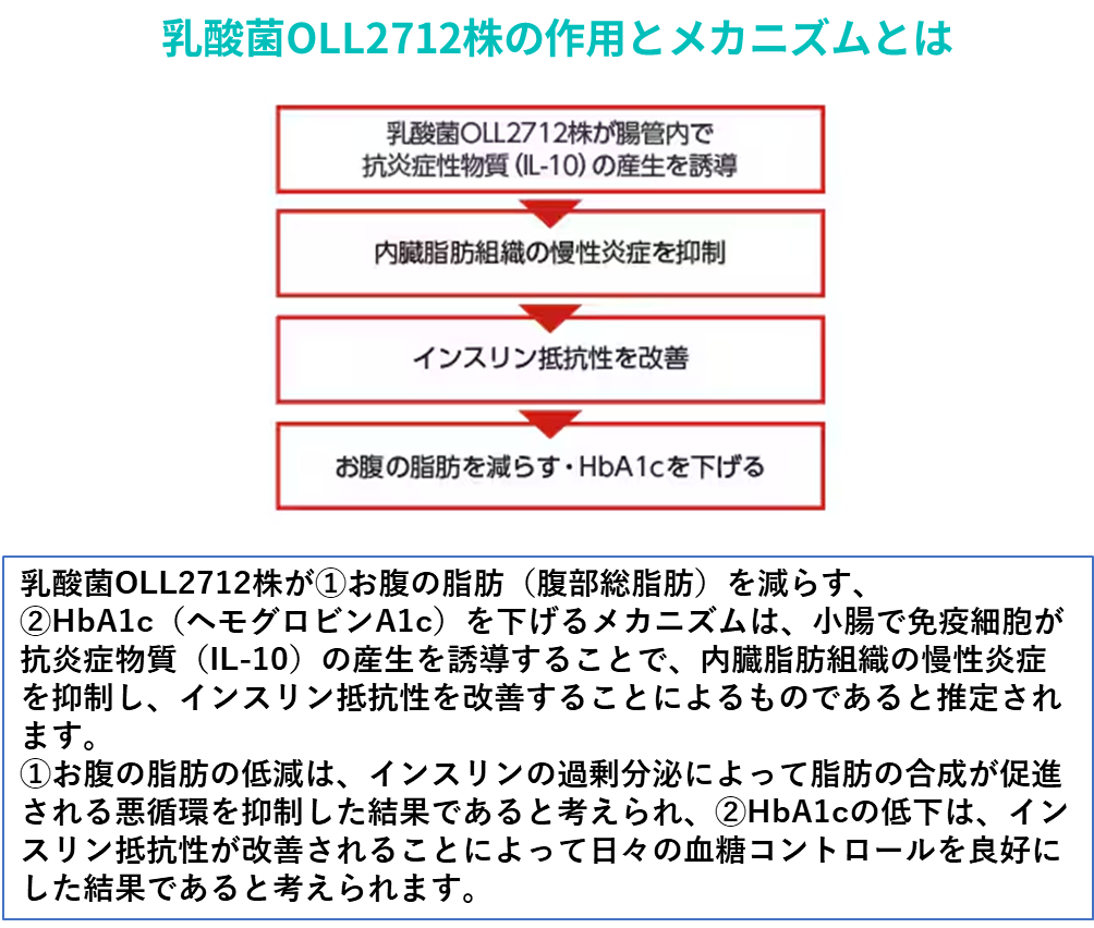 冒頭から説明してきたように、血糖値の上昇のもとを辿れば脂肪分解による炎症の慢性化でした。そしてこの乳酸菌OLL2712群は、腸内環境で抗炎症性物質を産生し、炎症の慢性化を抑制することがわかりました。炎症の慢性化が抑制されればインスリンの効果が減ずる(インスリン抵抗性があがる)こともなく、体内での糖と脂肪のコントロールが正常にできるので血統値が適正に保持できるというわけです。