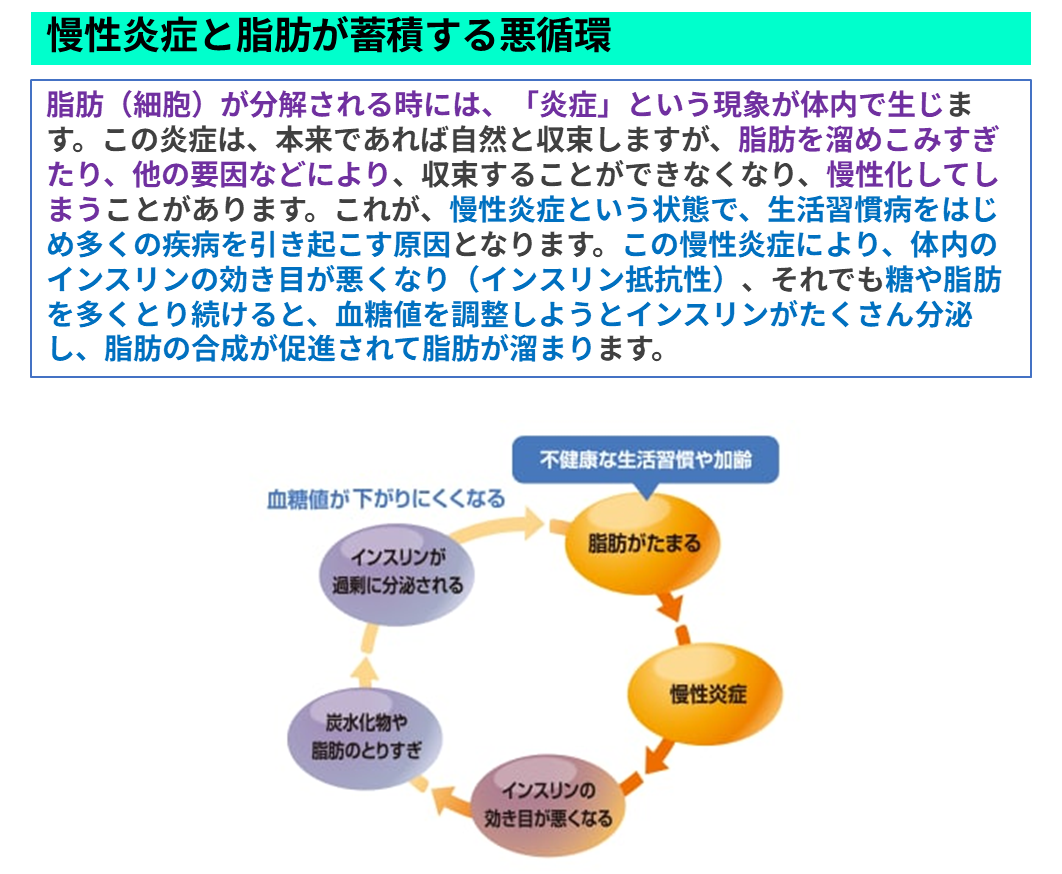 脂肪を分解してエネルギーとして使用する際には体内で「炎症」が起きてしまいます。通常収束するこの「炎症」は、時として収束できず慢性化します。するとこのブドウ糖/脂肪のコントロールをしているインスリンの効き目が悪くなり、取りすぎた糖や脂肪を処理しようとたくさんのインスリンが分泌され脂肪の合成が促進されて脂肪が溜まってしまいます。このようにして脂肪が溜まってしまうのです。
