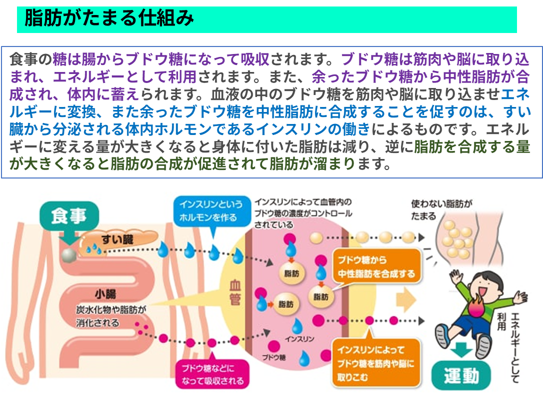 以下要約です。脂肪がたまるのは食物として摂取した脂肪がそのままたまるのではなく、食物中の糖が分解されブドウ糖となって吸収され、エネルギーとして使用されたのち余ったものが体内で中性脂肪に合成され、それが体内に蓄積されるからです。よく脂肪の採りすぎと言われますが、正しくは脂肪の合成しすぎなのです。こうしたブドウ糖をエネルギーとして使用したり、脂肪に合成したりするのは、すい臓から分泌されるインスリンの働きによるものです。