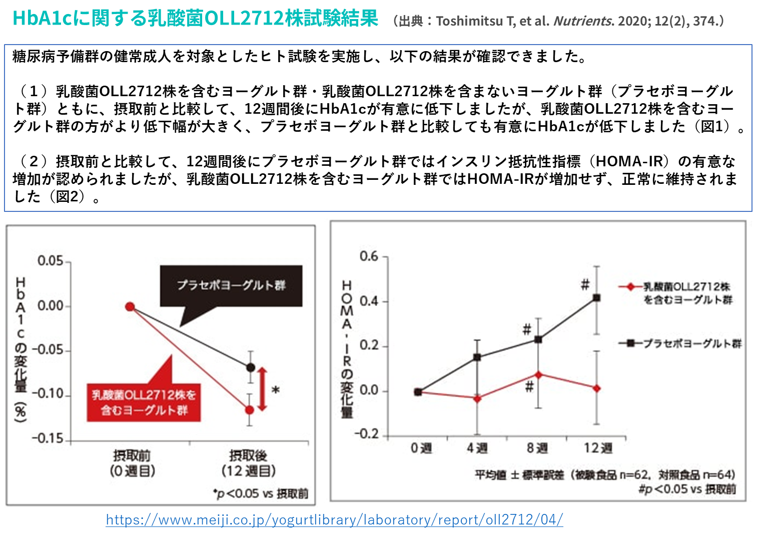 上図左は、ヘモグロビンA1c(HbA1c)の抑制効果を示したものです。糖尿病予備軍の人たち130人を対象にした12週間の試験において、乳酸菌OLL2712群を含むヨーグルトを摂取した人たちは、プラセボを含むヨーグルトを摂取した人たちに比べよりHbA1cを減少させました。