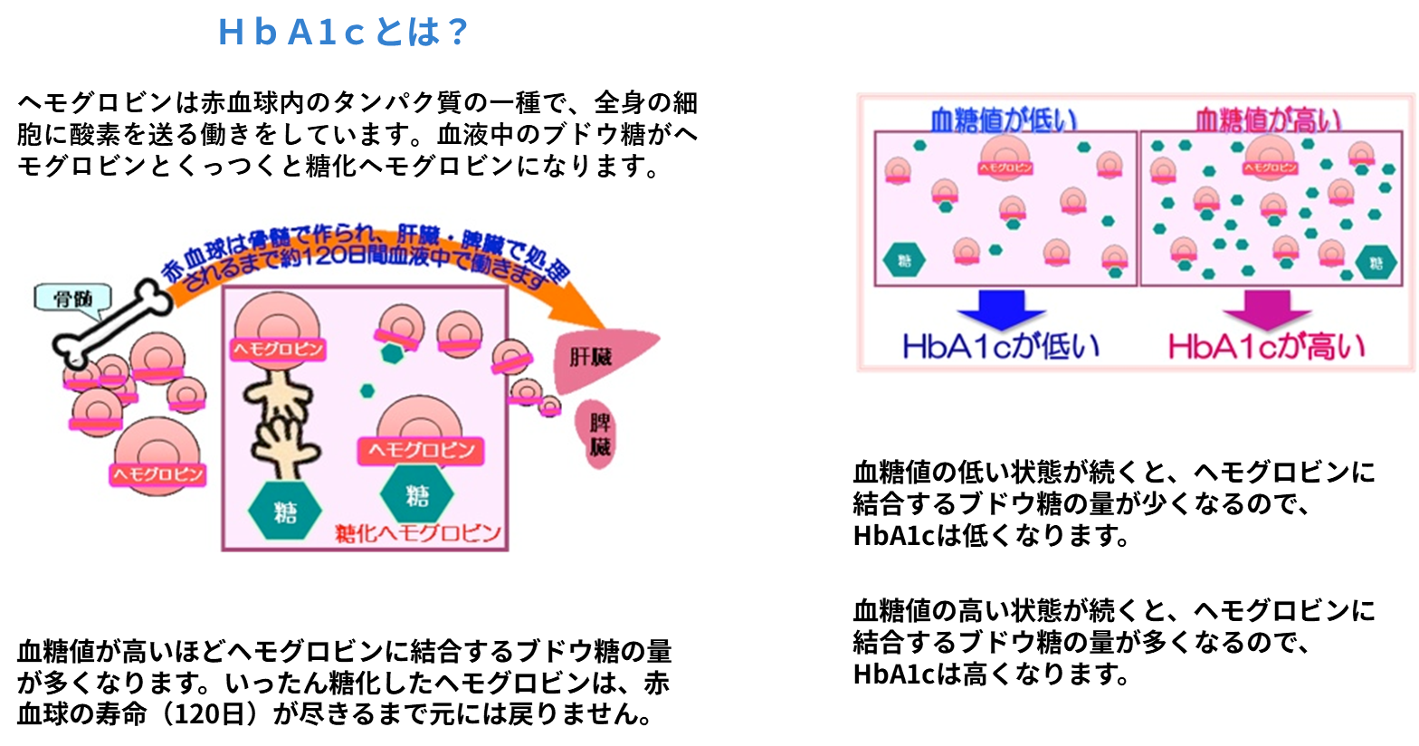 HbA1c赤血球内のタンパク質で、血液中ではブドウ糖がヘモグロビンと結びつき糖化ヘモグロビンとなります。血糖値が高いとヘモグロビンに結合するブドウ糖が多くなり、血糖値が低いとヘモグロビンに結合するブドウ糖が少なくなります。HbA1cとは、ブドウ糖と結合したヘモグロビンの割合を表わしたものです。