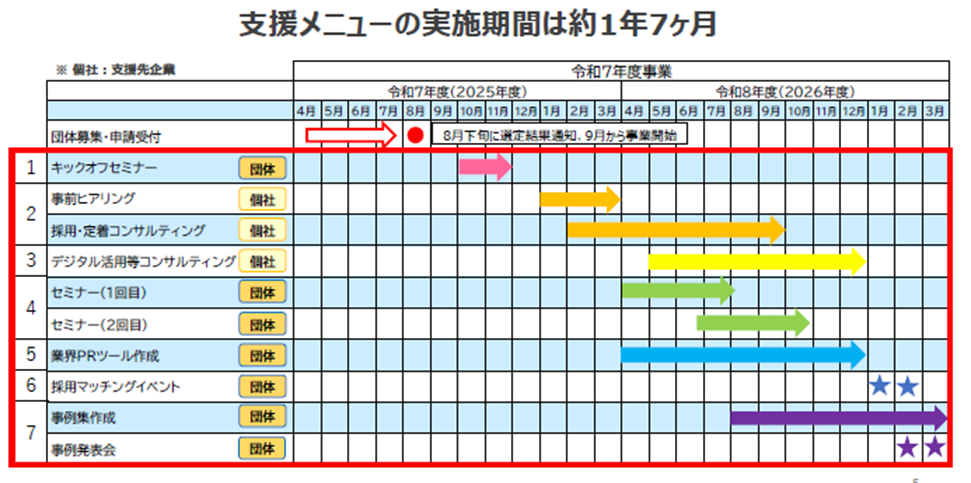 7月18日に申請に伴う当組合へのヒアリング、8月の財団による審査を経て、8月28日に支援決定の通知をいただきました。本事業の実施期間は約1年7カ月と長丁場で、以下のスケジュールで実施していきます。プログラムの運営は、財団から委託をうけたパソナ(株)が担当します。