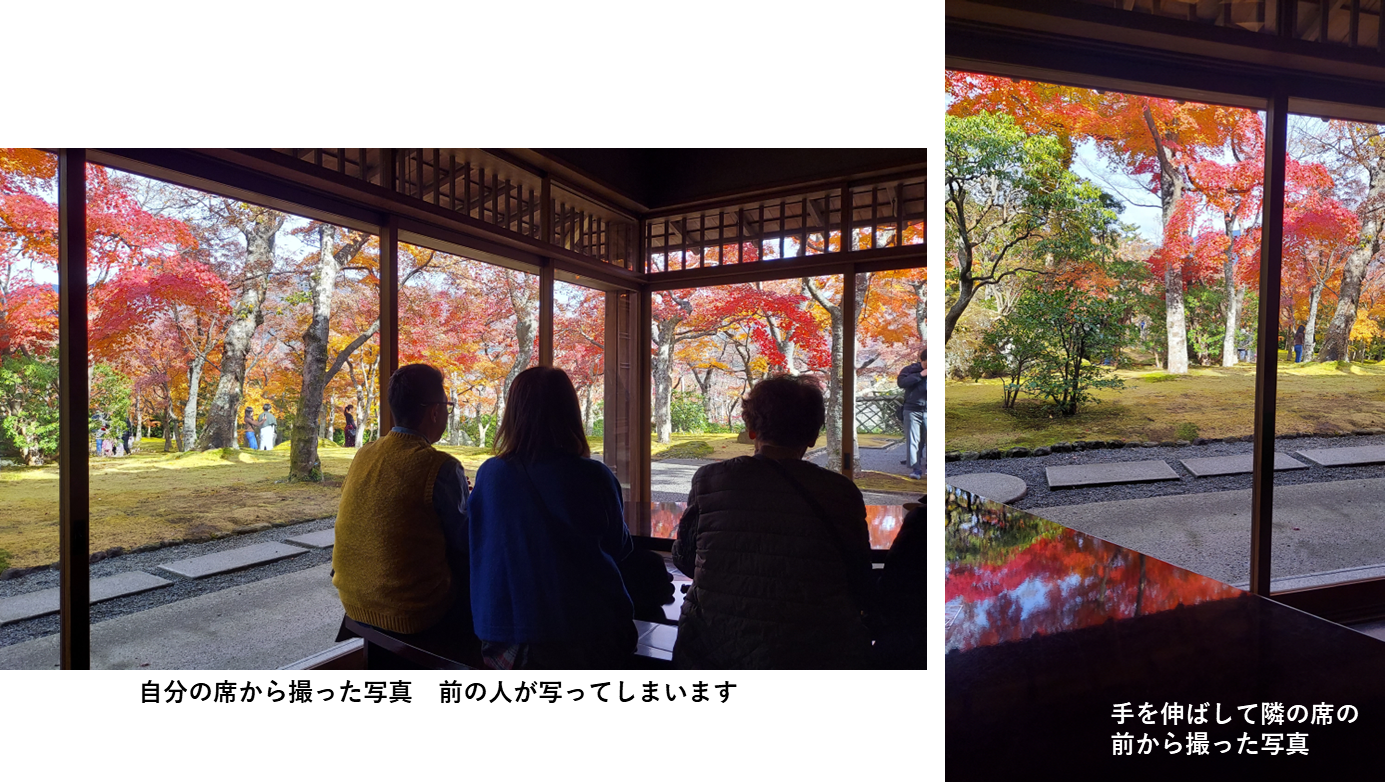 一番前のテーブルは座っている人に隠れてほとんど見えません。仕方がないので外が直接見える横を向いて隣の席の前まで手を伸ばして撮ったのが右の写真です。すこしですが、机に映る紅葉が撮れました。