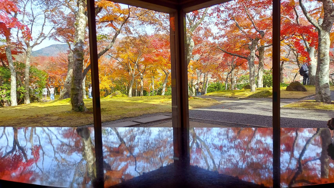 こうした机に映る紅葉と外の景色の一体化では、京都八瀬の瑠璃光院の夜景が有名ですが、こちらはこの建物のおかげで昼間に右のような景色を楽しむことができるのです。とは言え左の写真をよく見ていただきますと机がたくさんあり、右のような写真を撮るためには一番前の机に座らなければ撮れないのです。座席は基本的に列に並んだ順に案内されますので、一番前の机に座れるとは限りません。希望すれば一番前の机が空くのを待つことはできますが、それも面倒なので順番通りに座席につきました。前から2番目の机でした。