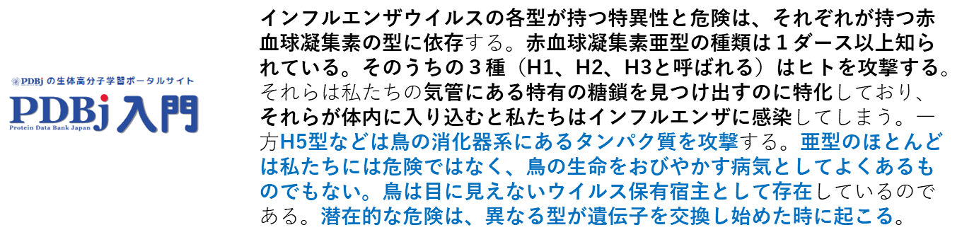 ここに重要な情報があります。インフルエンザウイルスのヘマグルチニンは16種類が発見されていますが、そのうちヒトに感染するのは、今のところH1,H2,H3の3種類のみであるということです。