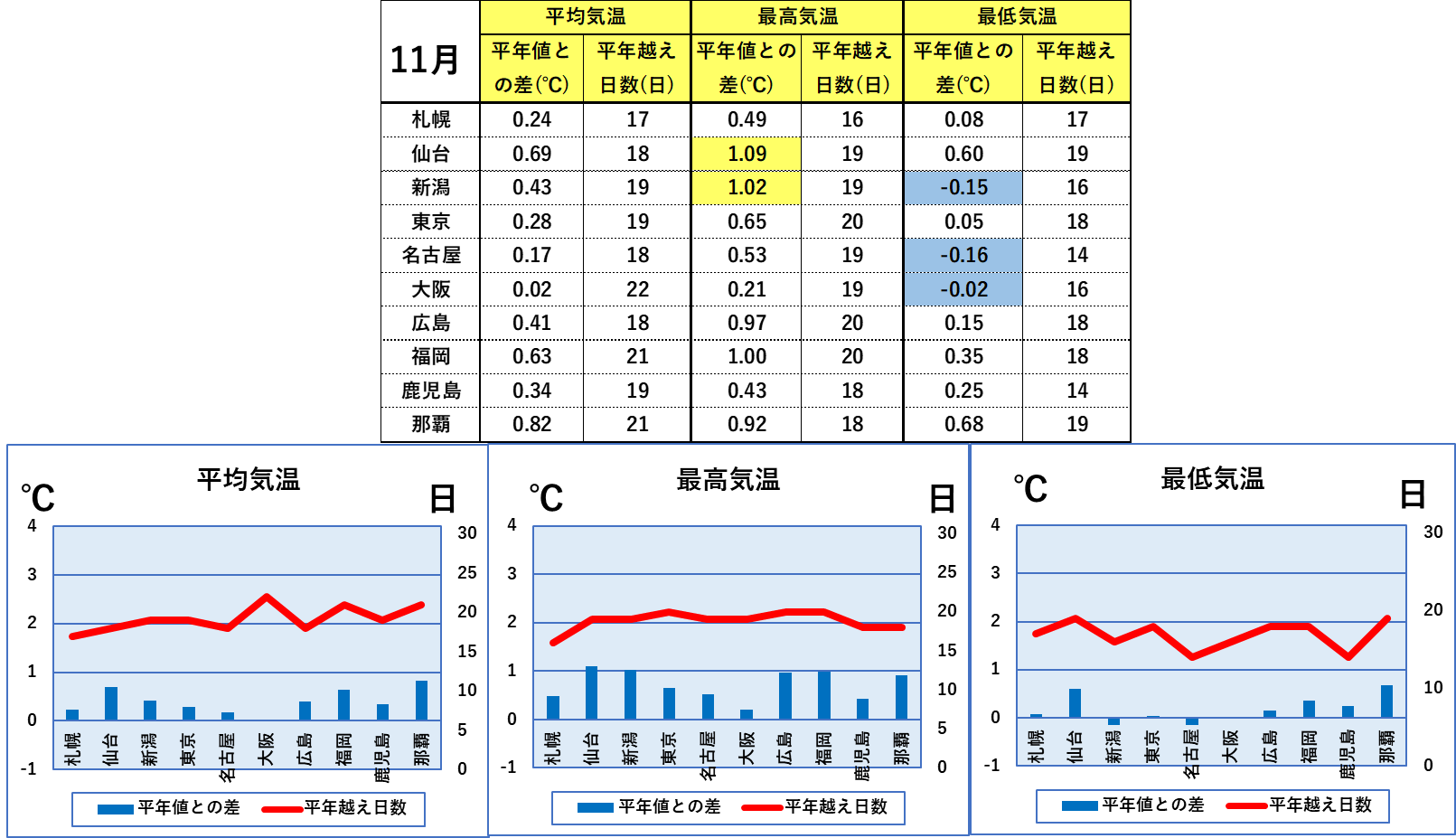 11月の気温上昇は小幅にとどまるも平年値超えは変わらず