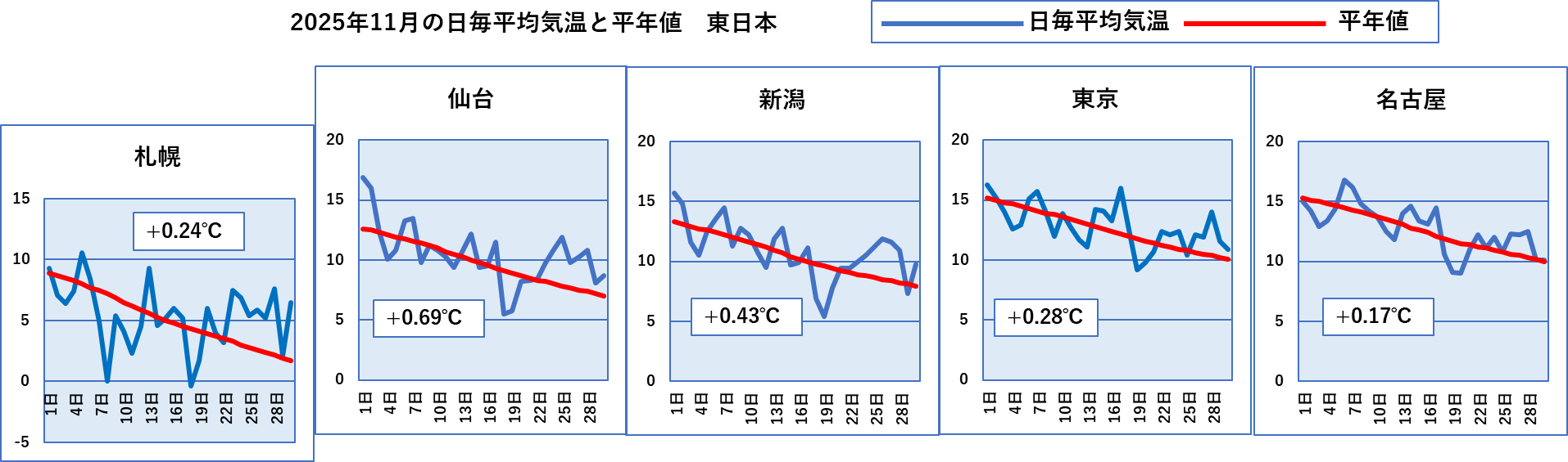 11月の各地の日毎平均気温はすべて+1.0℃までの間に収まりました。ただし平年値からはいずれもプラスではありますが、夏季のような大幅なプラスは影を潜めました。