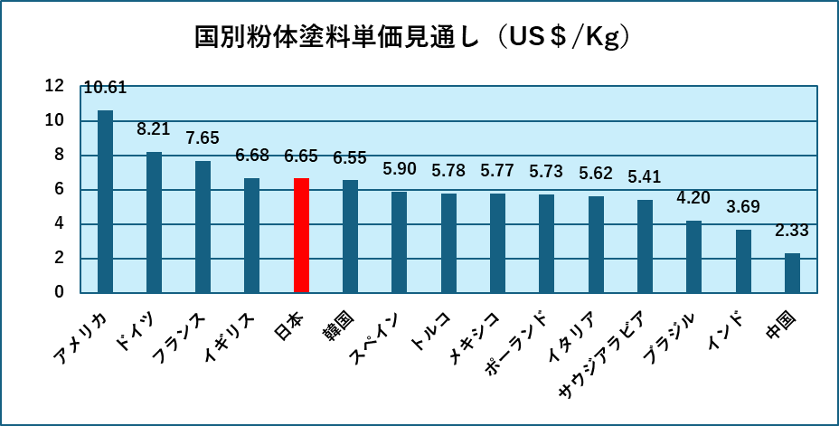 アメリカが10.6$/Kg、ドイツが8.2$/Kg、日本が3¥6.6$/Kgとこのあたりはまあ当たらずとも遠からずなのですが、中国は単価が2.33$/Kgとなってしまいました。1$=155円で計算すると361円となります。平均単価361円の粉体塗料というのはあり得るのでしょうか?