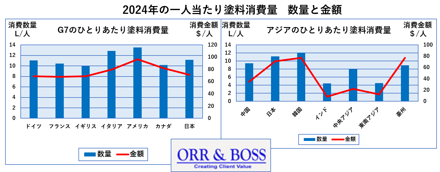 数量ではやはり中国がずぬけて多いとなります。2位のイタリアや3位のポーランドの2倍以上の需要があることになります。ちなみにこれもOrr &Bossのデータで2024年の各国の塗料数量と金額の図があります。(下図)