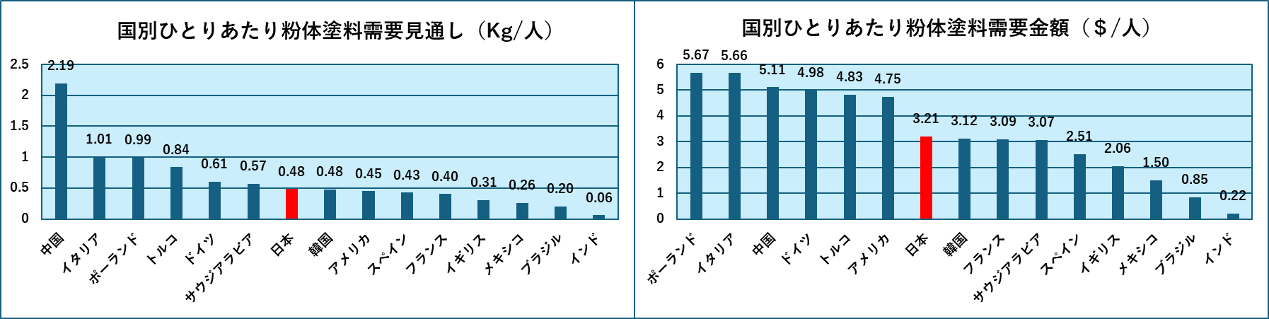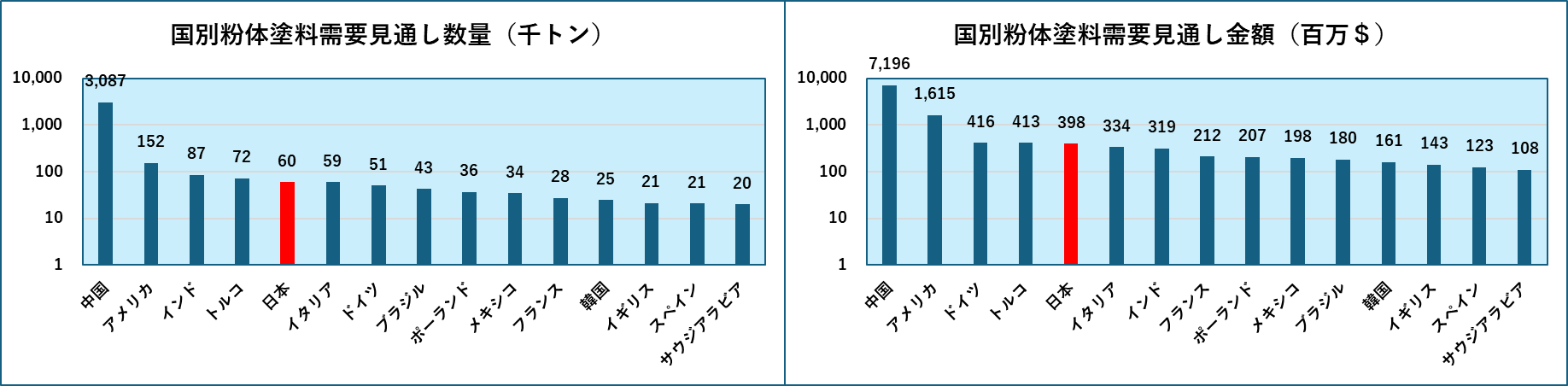 ここでも中国が圧倒的なシェアを誇っており数量では世界の3/4弱、金額でも5割強のシェアを有しています。国別の粉体塗料需要数量と金額の図を示します。中国があまりにも多いので縦軸は対数軸にしています。