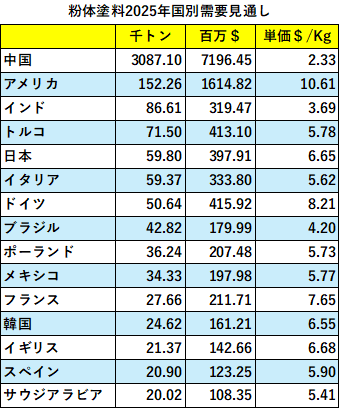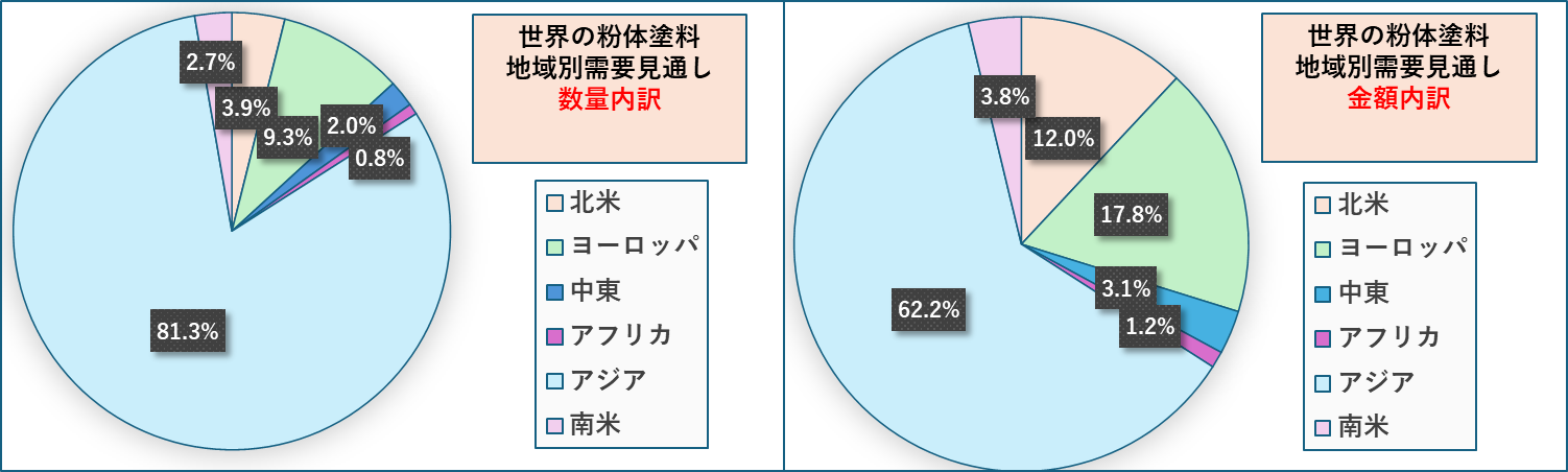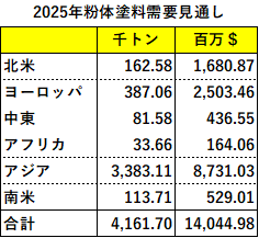 世界の粉体塗料2025年における需要見通しは416万トンであり、その内訳はアジア、なかんずく中国が圧倒的多数を占めています。金額は140億$、1$155円として2兆1700億円と推定されています。