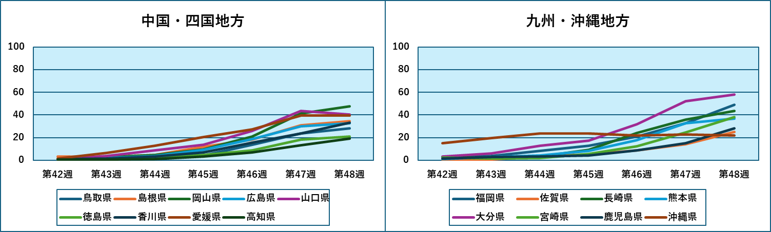 第47週まで最も感染者数が多かった東北地方や関東地方ではピーク超えが明らかな一方、中国・四国地方、九州・沖縄地方では、まだ減少に嘆じていない県がほとんどとなっています。