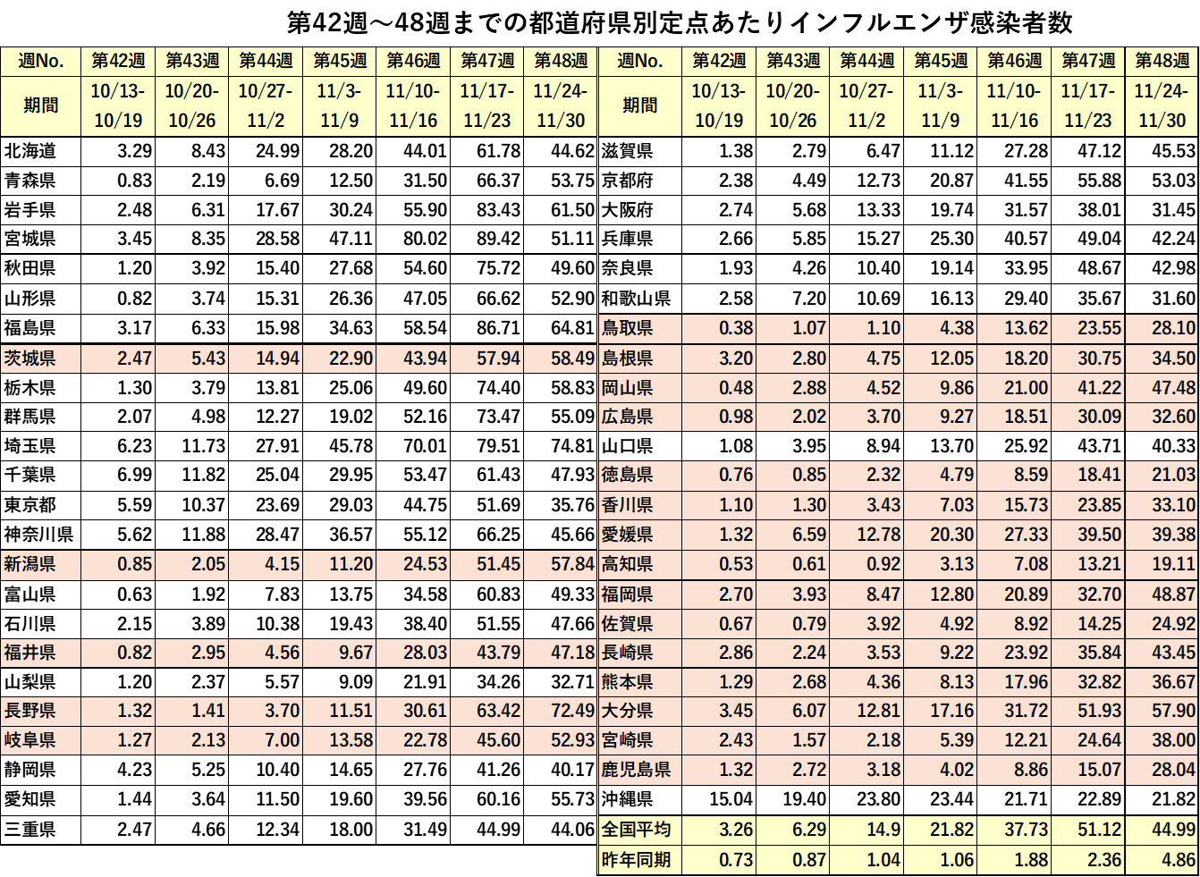 先週金曜日に厚労省から発表された第48週(11月24日~11月30日)におけるインフルエンザの感染状況ですが、全国平均の定点あたり感染者数が、第47週の51.12人から44.99人と減少に転じてピーク超えしたことを示しています。ただし、あくまで全国の平均値であり。地域的にみると西日本の中国・四国地方と九州地方ではまだ増加が続いていますので、単純にピーク越えと言ってしまうのは早計かもしれません。