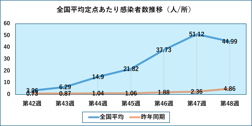 まず、ピーク時期ですが、第48週というのは、2004年以降では最も早いピークと同じであり、極めて早い時期の流行だったということです。そしてピーク時の定点あたり感染者数は51名で、これも2004年以降では高い方から3番目であり、かなり大規模な流行であったと言えます。また流行入り(定点あたり感染者が1.0を超えた週)からピークに至るまでの期間は9週間であり、これも2004年以降では長い方から5番目で、長きに渡り感染が広がり続けたことを示しています。まだ20県で感染が増加していますので油断は禁物ですが、今秋金曜日に発表される第49週の感染者数は全国くまなく減少傾向となっていることを期待したいと思います。