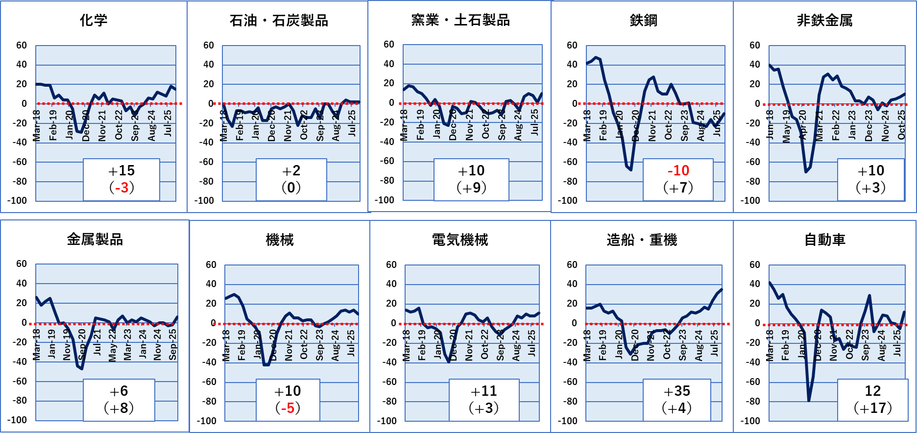 個々の業種では、塗料需要と関係がありそうな業種を選んで図示しています。DI値が唯一マイナスだったのは鉄鋼ですが、それでも9月よりは7ポイント改善しました。トランプ関税の影響で9月調査ではDIがマイナスとなった自動車も今回はプラスに戻しました。今回調査では機械以外ここに挙げた全業種が、9月のDIから改善しています。