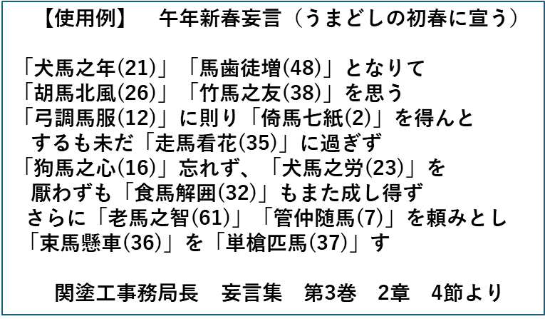 ご参考までに、新年にふさわしいポジティブな意味あいの馬を含む四字熟語だけを集めて、解説付きで載せさせていただきます。
