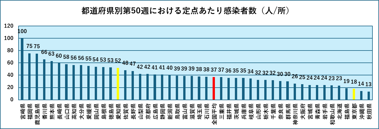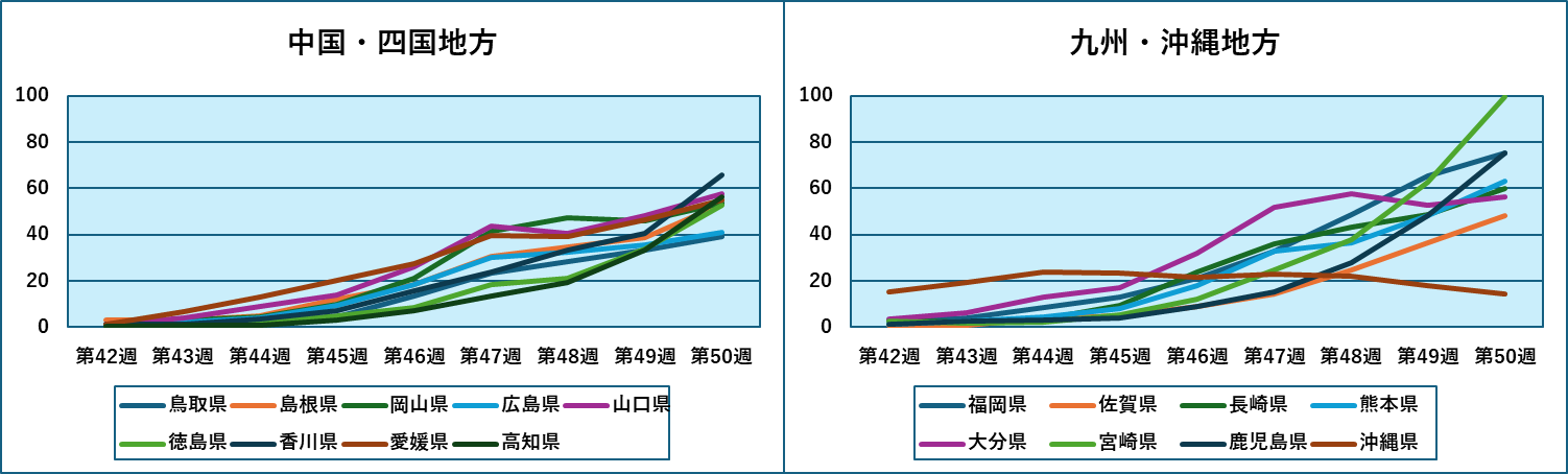 中国・四国、および九州地方では、定点あたり感染者数が50を超える県も多く、そろそろ収束に向かう時期ではないかと推測しています。なんとか年内に全国的な収束に至ってほしいと思っております。