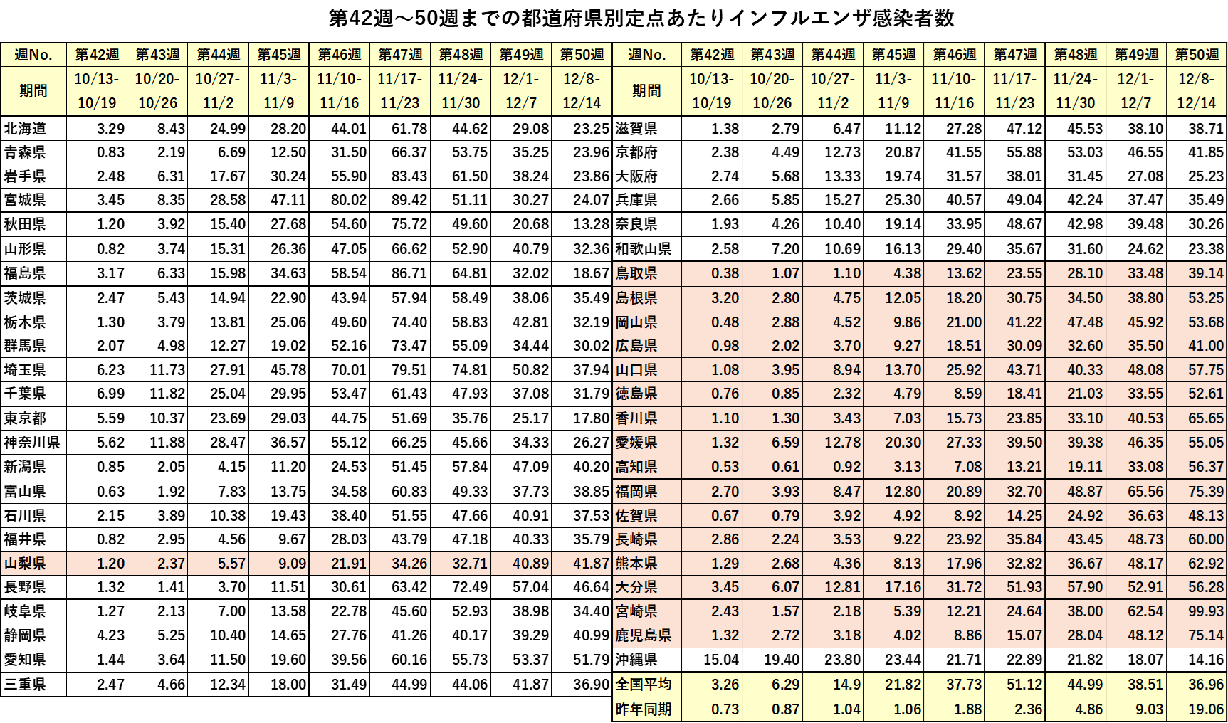 第42週から第50週までの各都道府県の定点あたり感染者数の一覧表をご覧ください。オレンジ色の県が感染拡大中の県です。