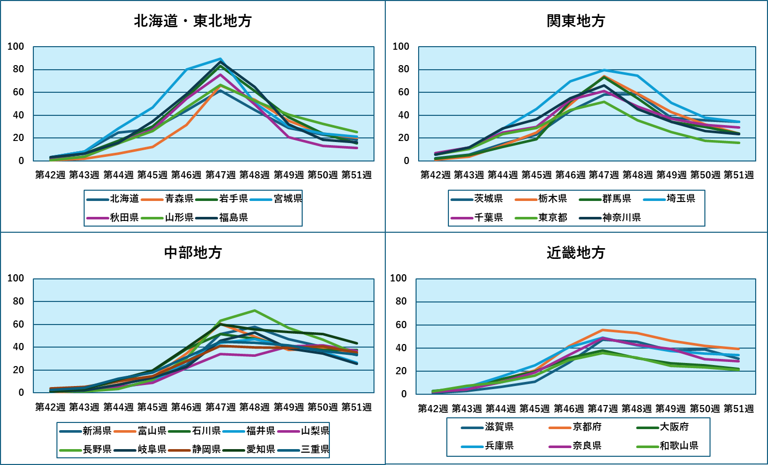 北海道から近畿までは、第47週がピークで4週連続の減少です。一方中国・四国と九州・沖縄では過半数が第50週がピークで、まだ増加が続いている県もあります。