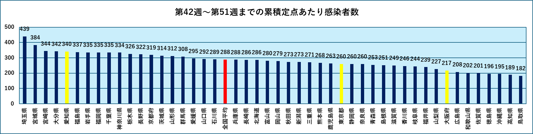 宮﨑県などは定点あたり感染者数が100近くまで達し、爆発的な感染状況になっています。となると累計ではどうなるのか気になりましたので計算してみました下図に第42週から第51週までの10週間の累計定点あたり感染者数を示します。
