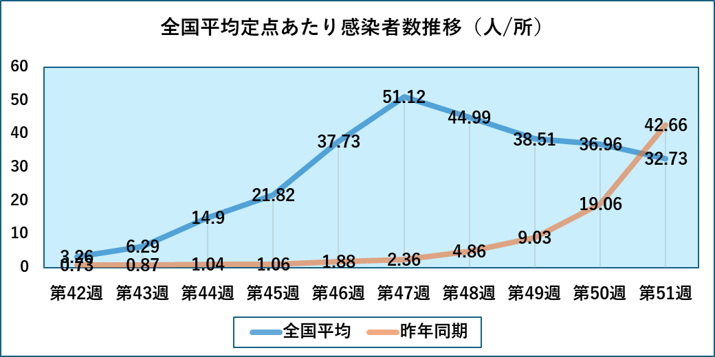 全都道府県でピークアウトならず・・インフルエンザ第51週の定点あたり感染者数