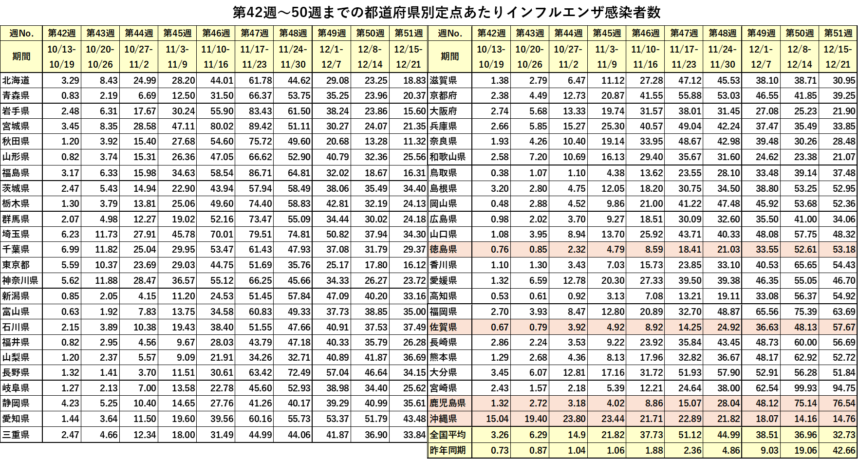 昨日厚労省から第51週(12月15日~21日)のインフルエンザ定点あたり感染者数が発表になりました。結果は、ほとんどの都道府県ですでに減少が始まっているものの4県で増加中(1県は再増加)であり、全都道府県そろって減少とはなりませんでした。