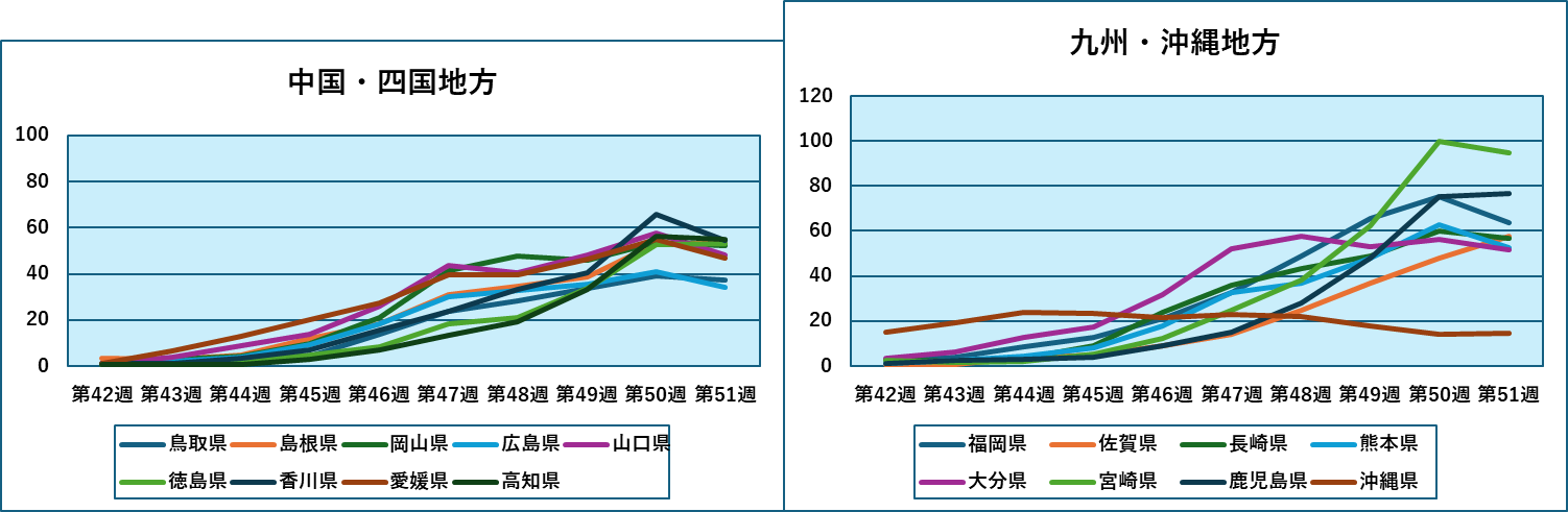 第51週における都道府県別の感染者数は、上位を九州、四国が占めており、西日本が上位を独占しています。