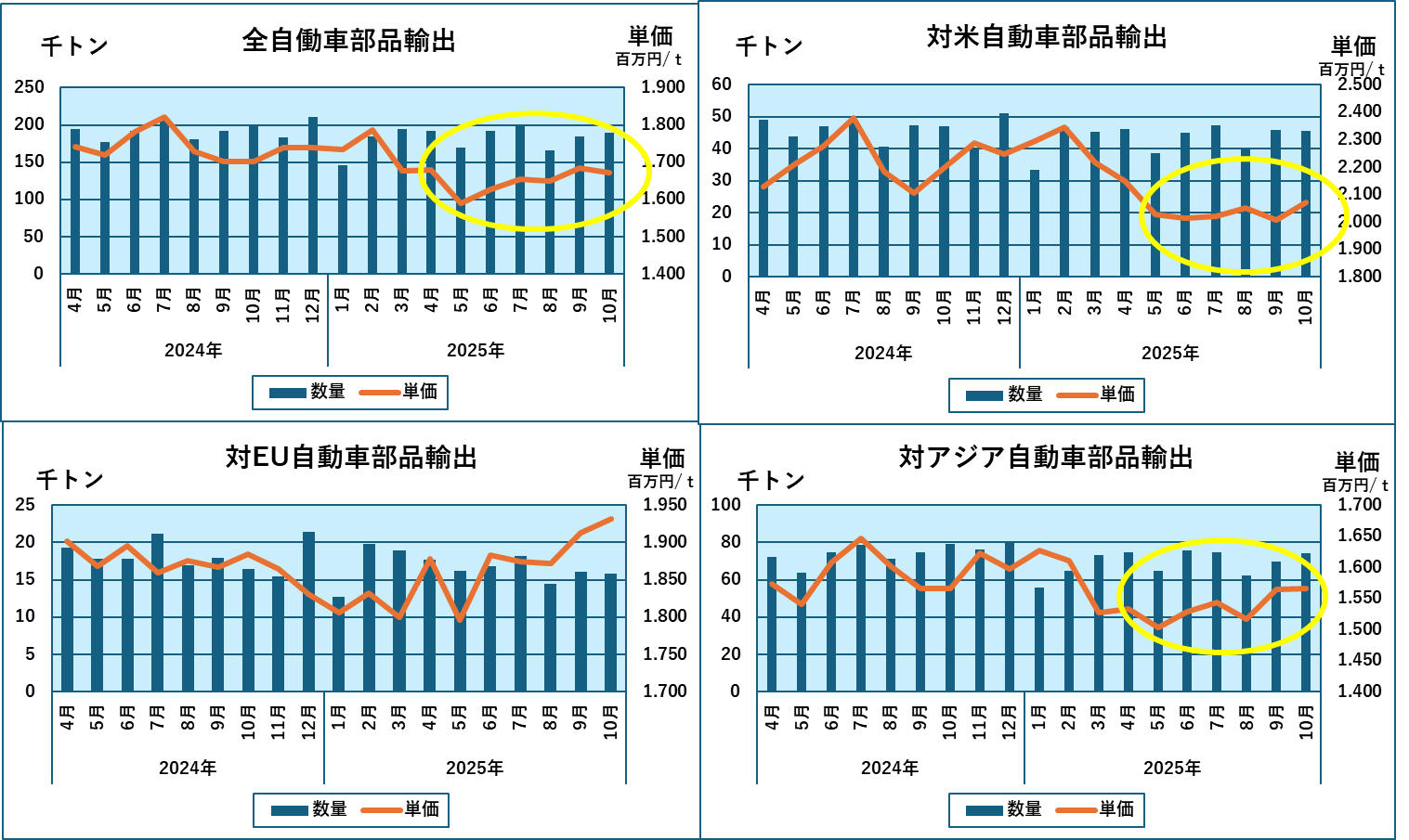 このところ毎月ご紹介している自動車および自動車部品の輸出状況ですが、10月の対米輸出の単価は緩やかに回復中ですが、まだ元の水準には戻っていない状況でした。