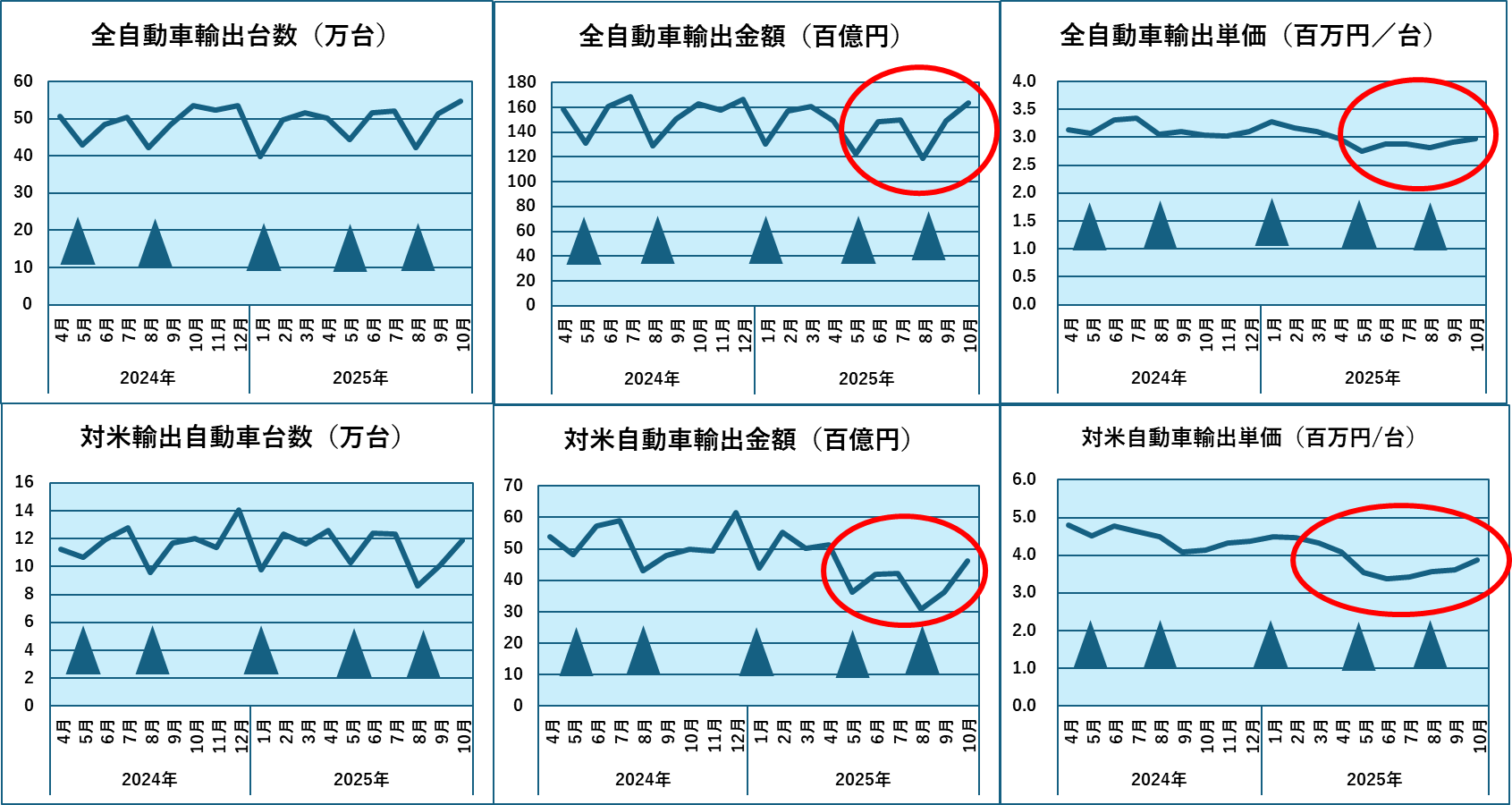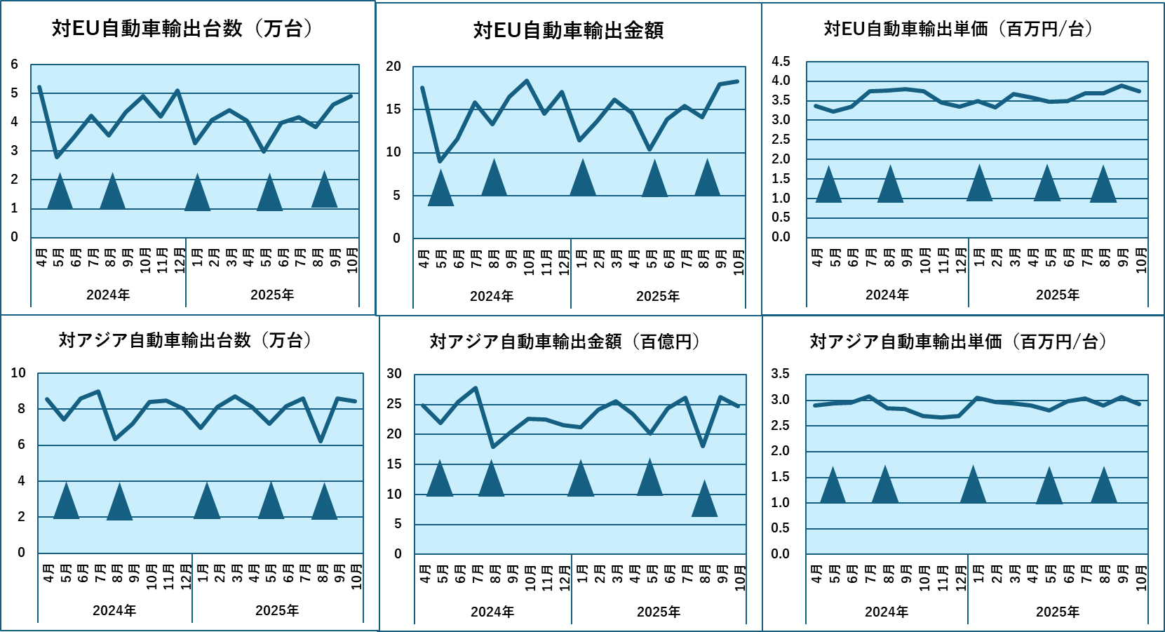一方、対EU、対アジアではそうした傾向は認められません。2025年における対米自動車輸出の単価低迷は、対米輸出特有な現象であこことは明らかです。