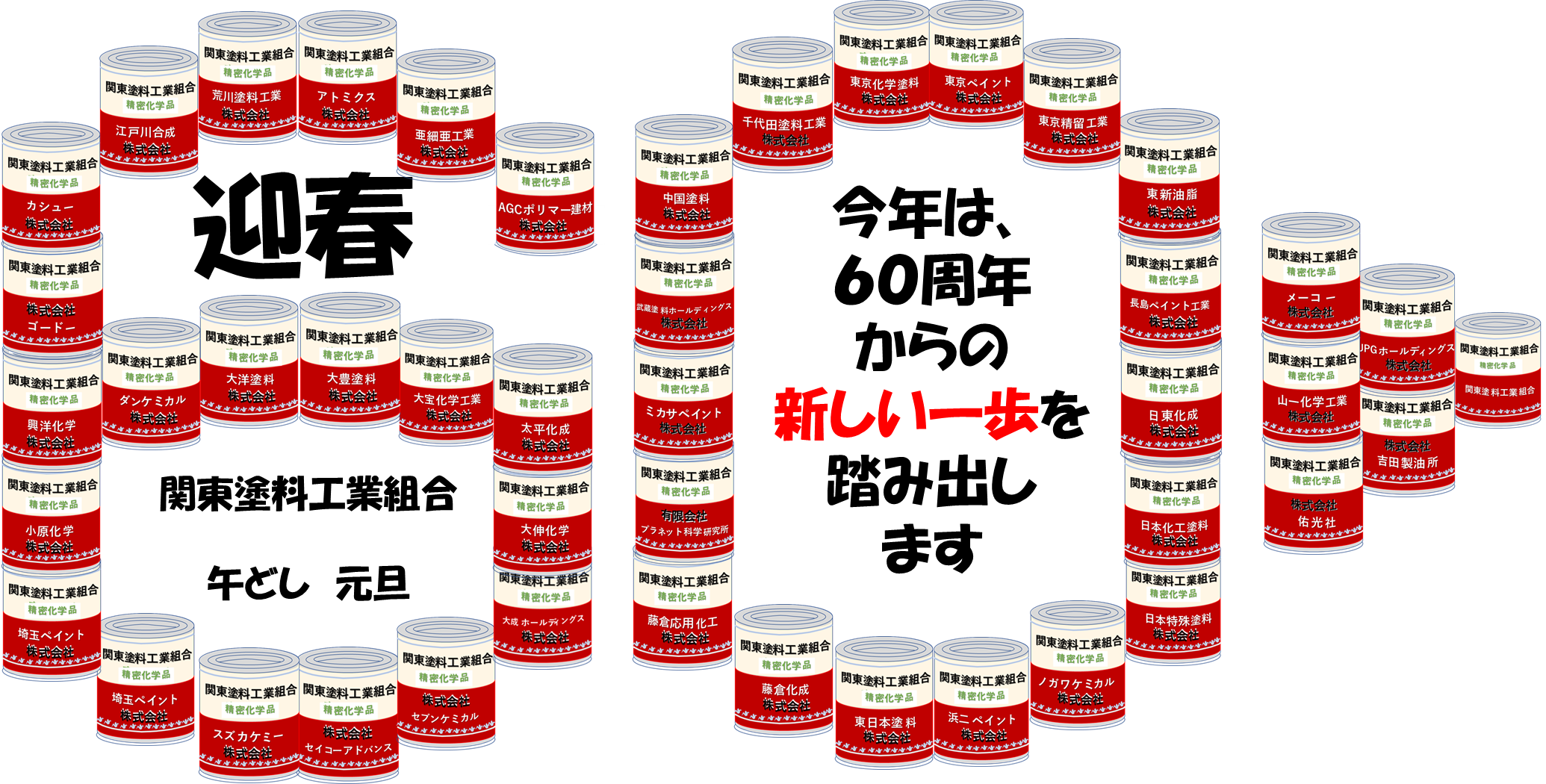 関東塗料工業組合は,昨年6月で創立60周年を迎えることができました。人間で言えば無事に還暦を迎えたことになります。これもひとえに組合員様、関係者のご理解とご協力の賜物と感謝しております。このところ新年のご挨拶はウオーホルのデザインをまねた缶に組合員全員46社の社名を入れたイラストを載せさせていただいておりましたが、今年は、還暦から新しい一歩を踏み出す年としてイラストを新たに作成いたしました。