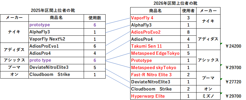 また2026年の赤字の商品は2025年にはなかった商品名で、2026年に初めて登場したものです。新しい商品がまだ続々と開発されているように見えます。ただし、これも各区間3位までの30名に限定して話なのであくまで限定条件付きでの推測になります。そして気になる値段もいくつかはわかりましたので右端に載せておきました。2万円台後半が多いようです。思ったほど高くはありませんでしたが、普通の靴よりは高いようです。