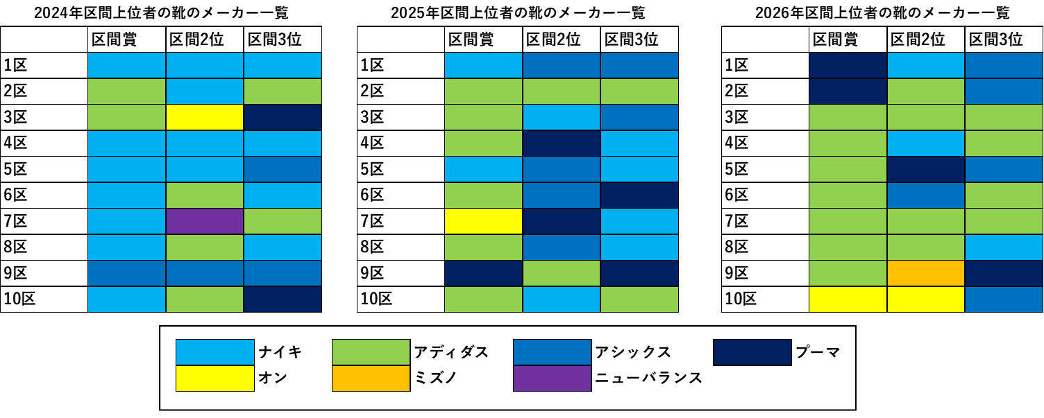 Alpenのサイトには各区間の1位~3位までの選手の履いた靴のメーカー名と商品名が載っていましたので、それもあわせてご紹介したいと思います。左から2024年、2025年、2026年です。