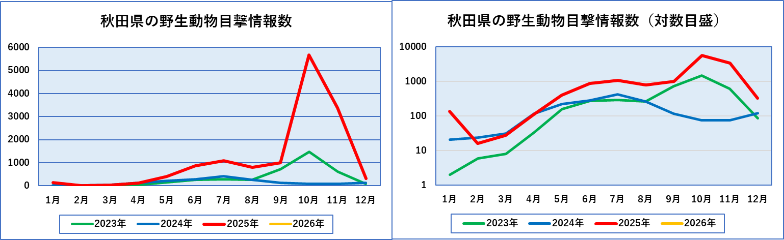 この「クマダス」は、本来野生動物目撃情報なので、ツキノワグマ以外にキツネや二ホンカモシカなども含まれていますが、ほぼほぼ出没状況の報告はクマに限られていますので、そのままの数字をグラフ化してみました。左が普通目盛り、右が対数目盛です。
