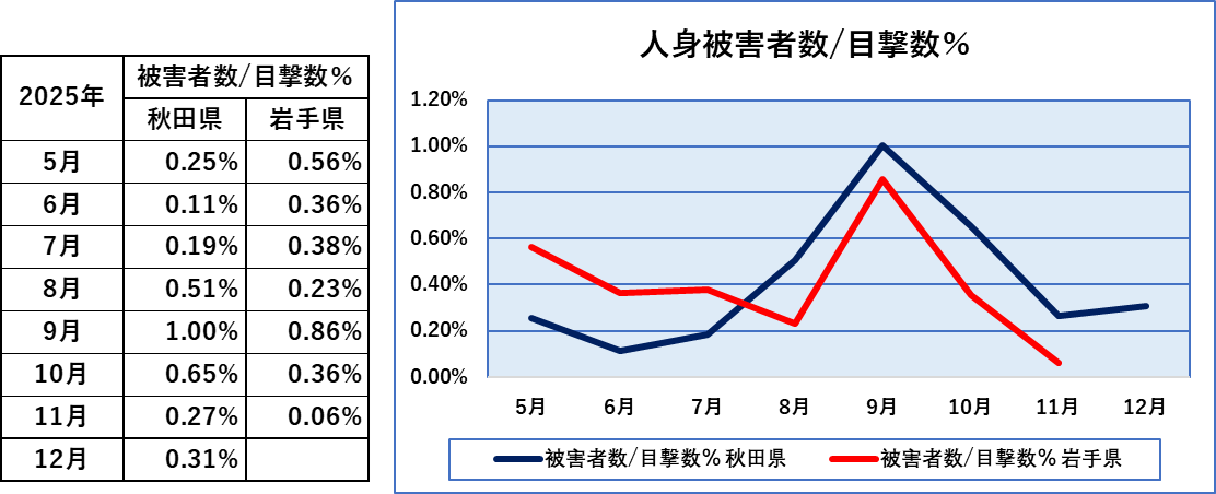 秋田県、岩手県とも似たようなカーブになりました。人身事故被害者数/目撃数の割合は9月が最も高く1%弱に達しています。目撃情報が比較的少ない時期はこの割合も下がるように見えます。ただ年間の通してクマの食料事情が一定なわけでもありませんので、単純な計算でものを言っていいのかという議論はあると思いますが、計算上はこうなるということでご理解ください。