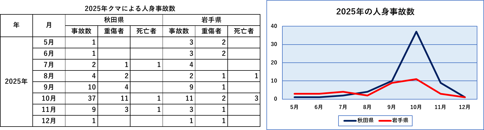 出没情報の減少に伴い、人身事故件数も同様に激減していました。12月の人身事故は秋田県、岩手県とも1件ずつであり、大幅に減少しています。しかし事故がなくなったわけではなく、秋田県の事故は12月24日秋田市内で起きており、まだまだ警戒を緩めるわけにはいかない状況に変わりはないようです。下の表とグラフに2025年5月以降の秋田県、岩手県の人身事故の状況を示します。