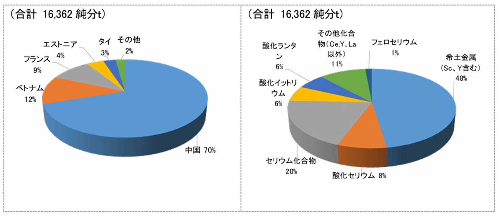 2023年に生産されたレアアースのマテリアルフロー、すなわち国別内訳、種類別内訳です。国別では盛んに報道されているように中国が圧倒的であり、種類別では金属状態でのレアアースが48%と最多で、酸化物を中心としたセリウムが2番目、さらに酸化イットリウム、酸化ランランと続きます。
