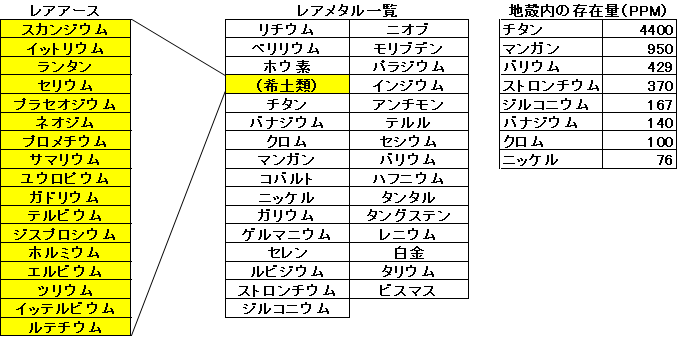 レアアースと聞く度に、それはレアメタルとどう違うのかとの思いがあったのですが、今回調べてみました。レアアースとレアメタルは下図のような関係にあります。