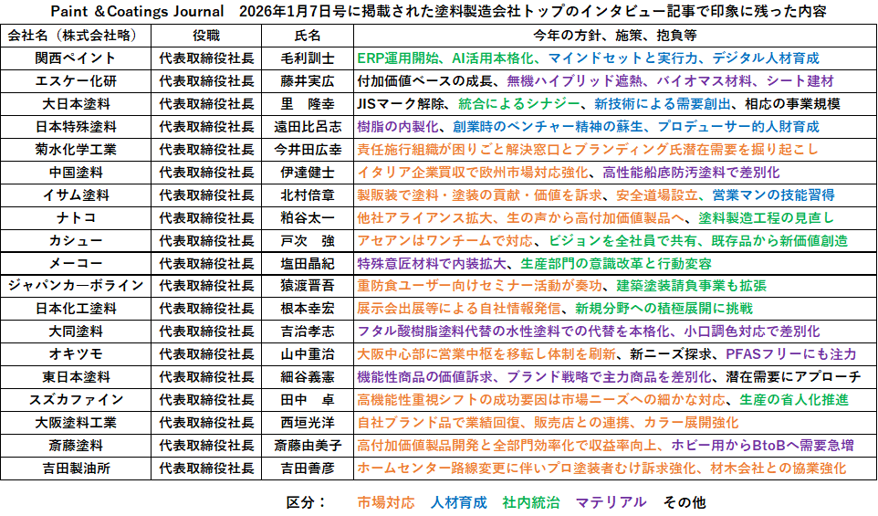 2026年に入り業界各紙の特集号で塗料業界各社のTOPのインタビュー記事が紹介されていますが、最も収録会社数の多かったPaint &Coatings Journal 2026年1月7日号から、記事の中から印象に残った事項を短くまとめてみました。あくまでこちらで勝手に解釈していますので、本来の趣旨と異なるという点もあろうかと思いますが、その節はご容赦ください。(ご本人からご指摘があれば訂正記事を載せます)