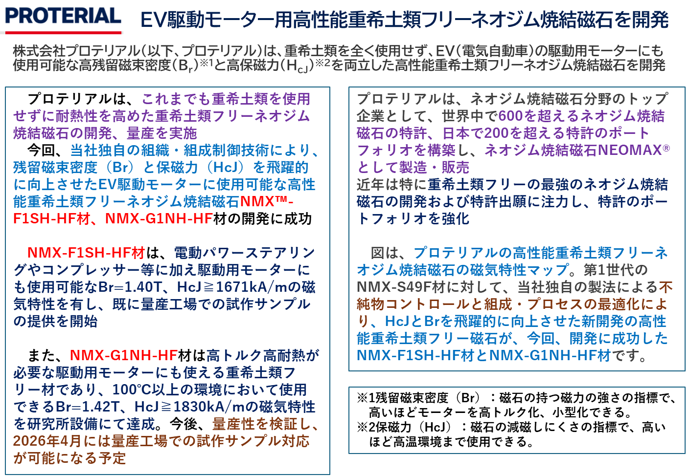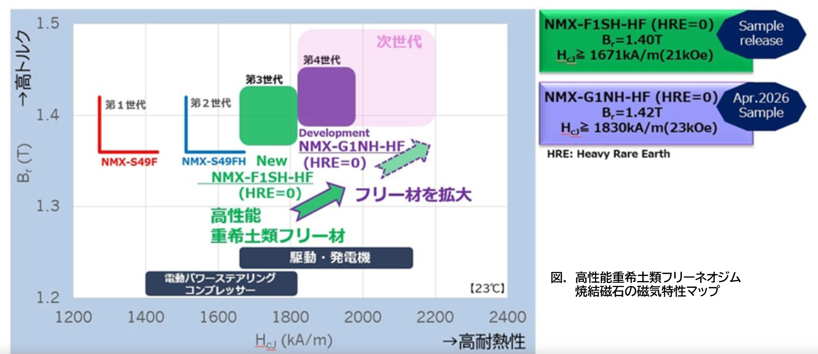 同様に重希土類フリーの磁石を使用したモーターについての発表は昨年にも株式会社PROTERIALからありました(下記接続先)。磁束密度と(高温における)保持力をジスプロシウムなしに両立させ、電気自動車に駆動用にも使用可能なモーターを開発したということですが、すでに第4世代とありますのでかなりの熟度に達しているのではと推測されます。ただし、どのようにして高温での磁力低下を防いだかという詳しい情報はありません。