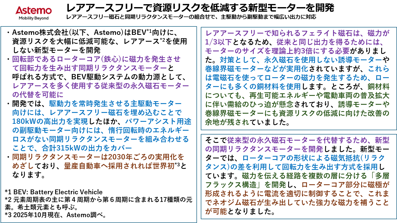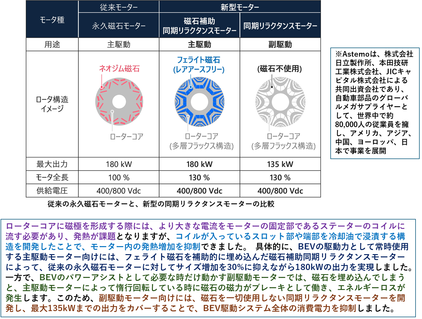 さらにレアアースを全く使用しないモーターについても発表がありました。日立製作所、本田技研工業、JICキャピタルが共同出資しているAstemoからの発表です。(下記接続先)