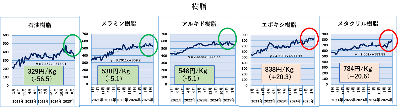 樹脂では3%以上単価変動は、石油樹脂の単価下落のみでしたが、エポキシ樹脂、メタクリル樹脂は3%に近い単価上昇でした。