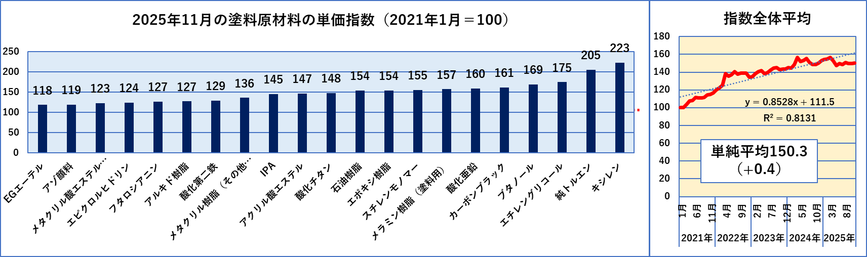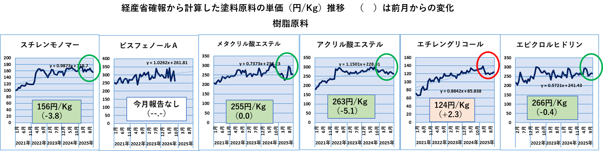 経産省確報(生産動態統計調査)2025年11月度から、塗料原材料の単価(出荷金額÷出荷数量)をご紹介します。