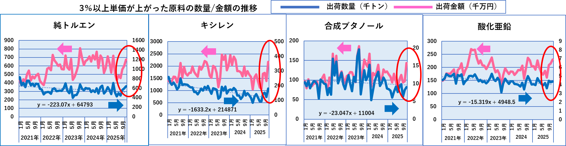 トルエン、キシレン、酸化亜鉛については、出荷数量が減少傾向で、その結果、数量と金額の乖離が大きくなっています。合成ブタノールについてもこの1年ほどでは数量と金額が乖離傾向にあります。いずれの場合も今月の単価上昇は、数量・金額ともに増加する中で金額の上昇が数量の上昇を上回ることで単価の上昇となりました。