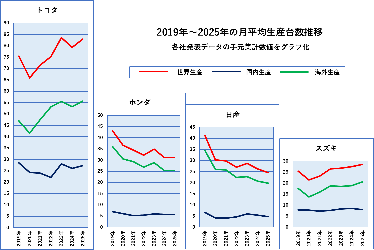 前年比で100%を超えたのは、トヨタ、ダイハツの国内と世界、スズキの世界生産だけでした。本ブログでは2019年以降のデータを手元で集計していますので、2019年~2025年の各社の国内、海外、世界生産の推移をご覧ください。2019年から2020年にかけてのコロナの落ち込みは全社共通ですが、それ以降の推移は会社によってかなり異なっています。上の4社の図、下の4社の図はそれぞれの中での縦軸は同じですので、見た目がそのまま台数の推移となります。ただし、上の4社の縦軸と下の4社の縦軸は異なっていますのでご注意ください。